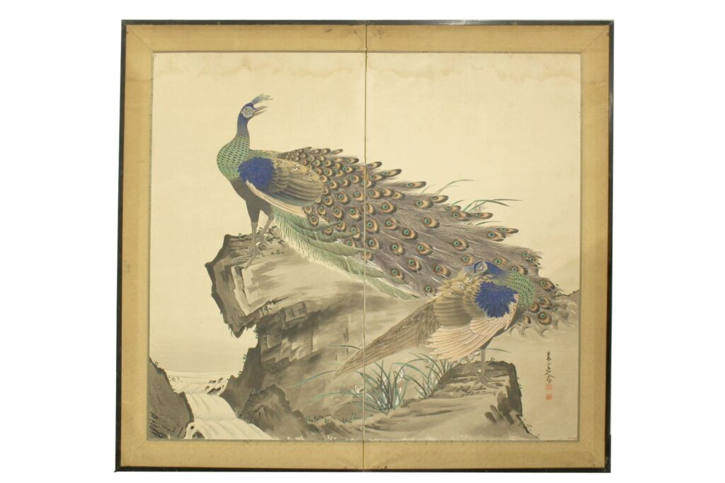 古美術 在銘 『双孔雀図』 屏風 二曲一隻  を買取いたしました。